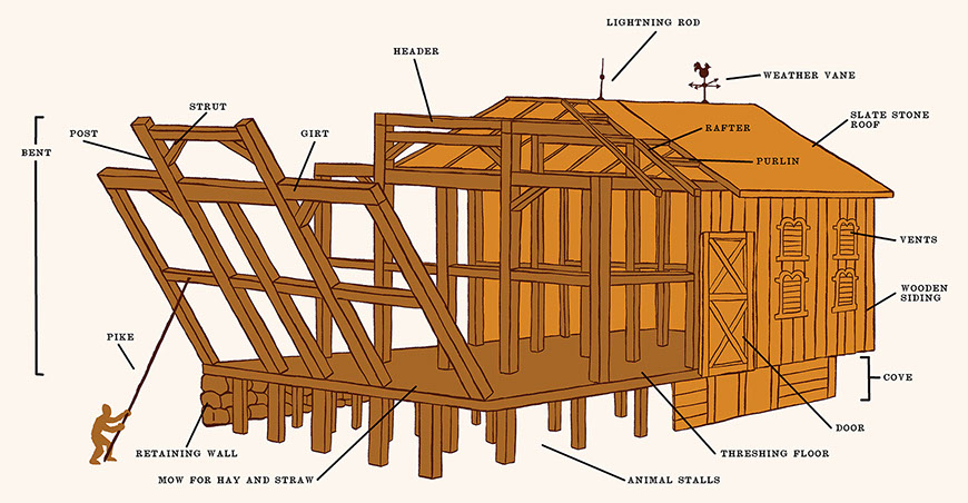 A barn requires a lot of wood. Fortunately wood was as close as the nearest tree. Chopping down trees on the farm had the added benefit of clearing land to create fields for planting. Trees were often cut down long before a barn was built to give the wood time to dry out. Each piece was then milled to its specific need. Once all the lumber was prepared, an open call would be made to the community surrounding the farm. A barn was far too large a structure for a family to build on its own. It took dozens of workers to turn the piles of wood into a functional building. This not only helped build the barn, but the community as well. It brought everyone closer together. Once the barn’s location was chosen and a clearing made, a stone retaining wall would be constructed. Floor beams and floor boards were laid in without nails. Under this floor would be stalls for the animals. On top of the floor grains would be threshed and hay and straw stored.
