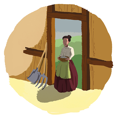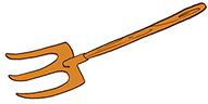 A farm tool with prongs like a dinner fork that's used for gathering and moving hay and straw