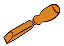 A long blade tool with a sharp, flat end and a handle meant for striking with a maul or mallet in order to shape wood